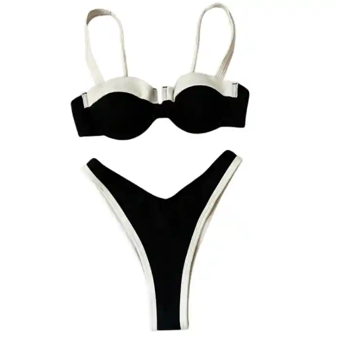 🔹 Top tipo balconette con copa estructurada, ideal para brindar mejor soporte y realce natural del busto. 🔹 Tirantes anchos en tono blanco/crema que contrastan con el negro, aportando un estilo moderno y sofisticado. 🔹 Diseño firme que estiliza y define la parte superior. 🔹 Panty tiro alto en corte “V” pronunciado, perfecto para alargar visualmente las piernas y resaltar la cintura. 🔹 Detalle de vivos blancos en los bordes que crean un contraste limpio y elegante. ✨ Un diseño clásico en negro con detalles claros que lo hacen versátil, atemporal y perfecto para lucir refinada en la playa o piscina. TALLA S