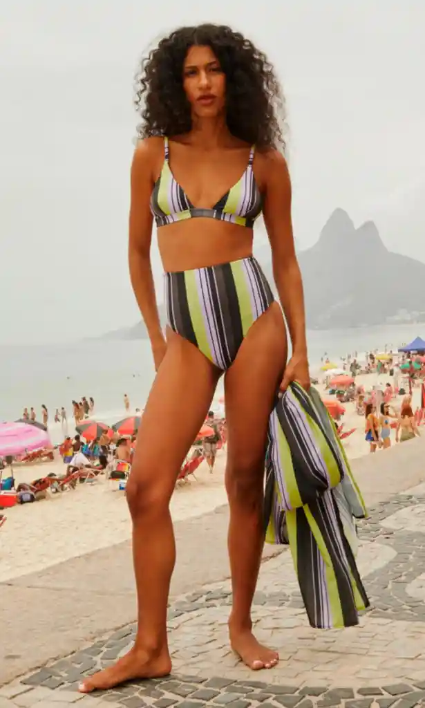 Set de bikini en nuestro print Bossa. Top estilo triángulo con tiras ajustables y broche en la espalda para un soporte cómodo. Panty de tiro de alto. 80% Lycra 20% Spandex. Se recomienda lavado a mano únicamente con agua fría y detergente suave, no usar decolorantes, no refregar, secado natural, no escurrir, no planchar, no usar máquina de secado.