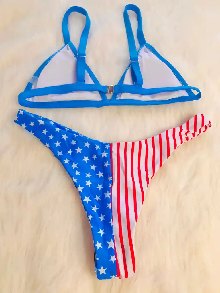 - Bikini top azul celeste, tanga bandera de USA - Talla S,M - Tela 80% nylon, 20% spandex - tanga talle alto