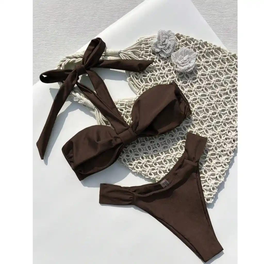 Este bikini de dos piezas en tono marrón chocolate es una joya minimalista con un toque sofisticado. Su diseño halter con gran moño central en el top aporta elegancia y feminidad, mientras que el corte clásico del panty garantiza comodidad y estilo. 👙 Top halter con moño: realza el busto y añade un detalle visual encantador. 🍫 Color chocolate profundo: ideal para resaltar cualquier tono de piel. 💫 Panty de corte limpio y favorecedor: con cintura ancha y suave caída en V. 🏖️ Perfecto para playa, piscina o sesiones de fotos: un básico con carácter. Disponible en Talla: M
