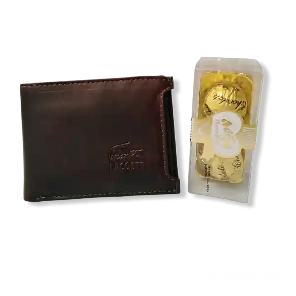 Billetera cuero 100% Legitimo, TRPLE A PREMIUM - MARCA LACOSTE, Color cafe, Acompañada de Chocolate Dúo caja dura 25g. Bolsa de regalo y tarjeta básica.