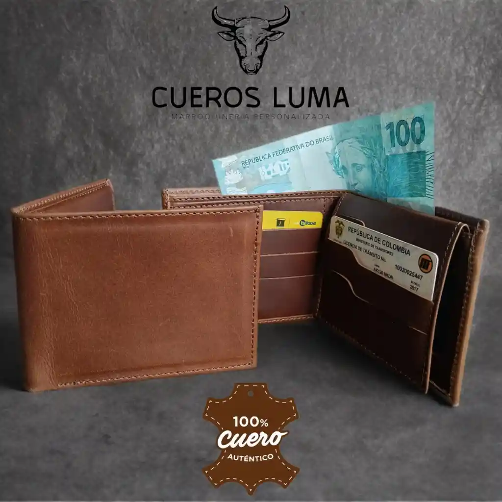 BILLETERA EN CUERO GENUINO CLASICA 20 CM Y 9,5 CM DE ALTO 6 ESPACIOS PARA TARJETAS DOS PARA FOTOS Y DOBLE ESPACIO PARA BILLETES
