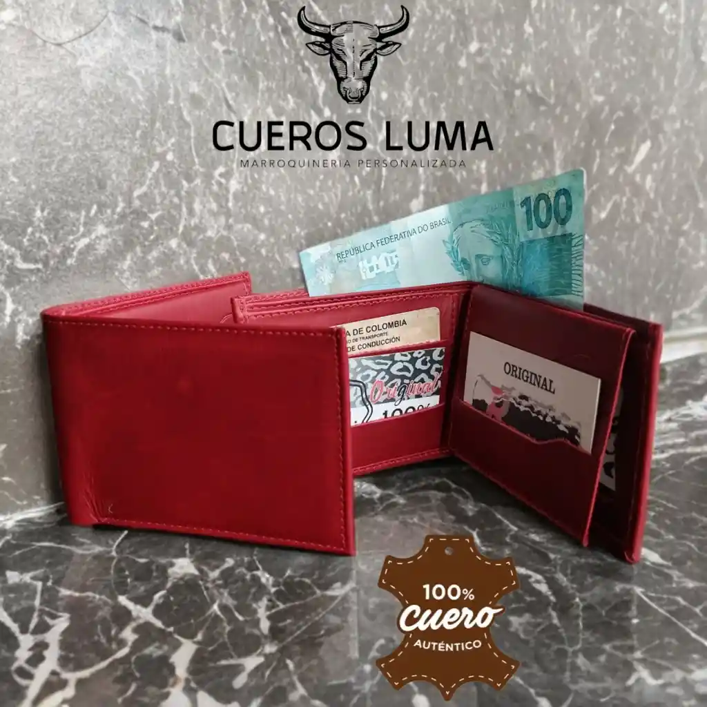 BILLETERA EN CUERO GENUINO CLASICA 20 CM Y 9,5 CM DE ALTO 6 ESPACIOS PARA TARJETAS DOS PARA FOTOS Y DOBLE ESPACIO PARA BILLETES