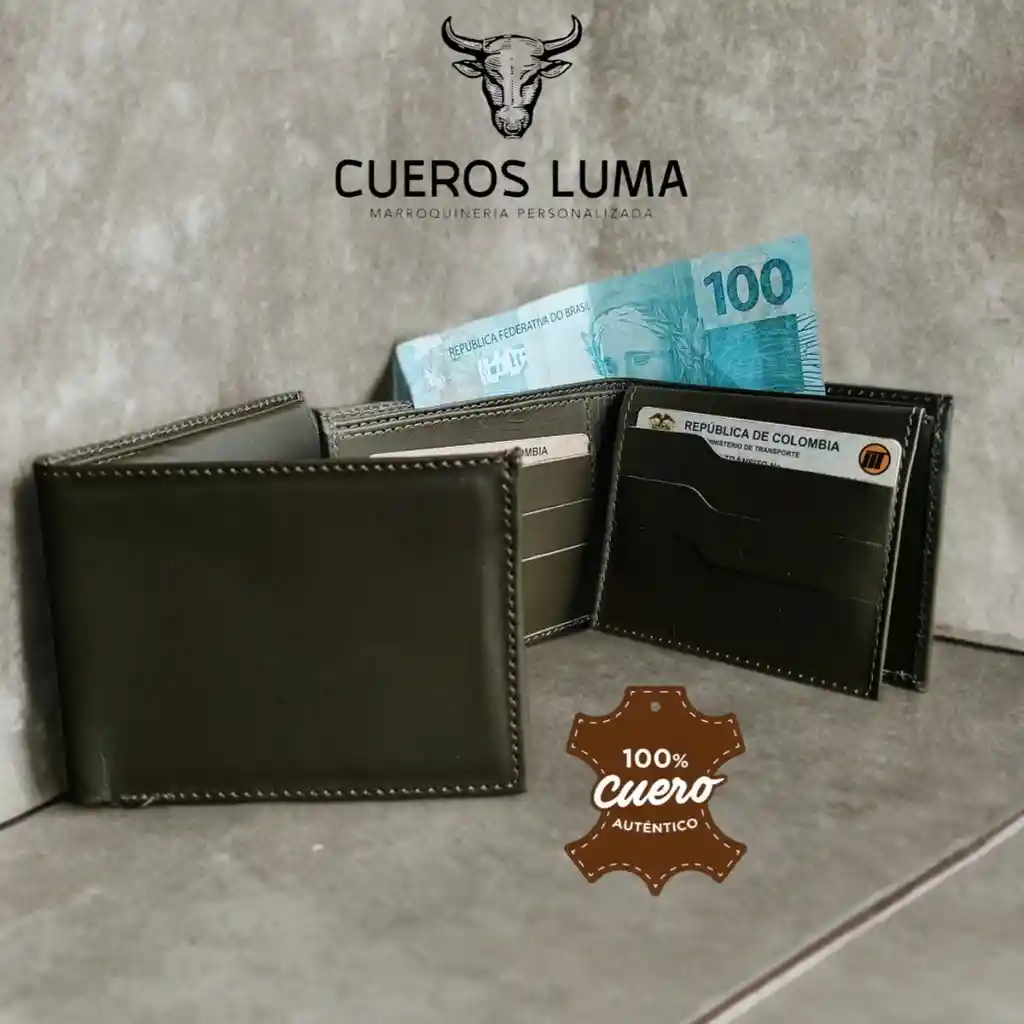 BILLETERA EN CUERO GENUINO CLASICA 20 CM Y 9,5 CM DE ALTO 6 ESPACIOS PARA TARJETAS DOS PARA FOTOS Y DOBLE ESPACIO PARA BILLETES