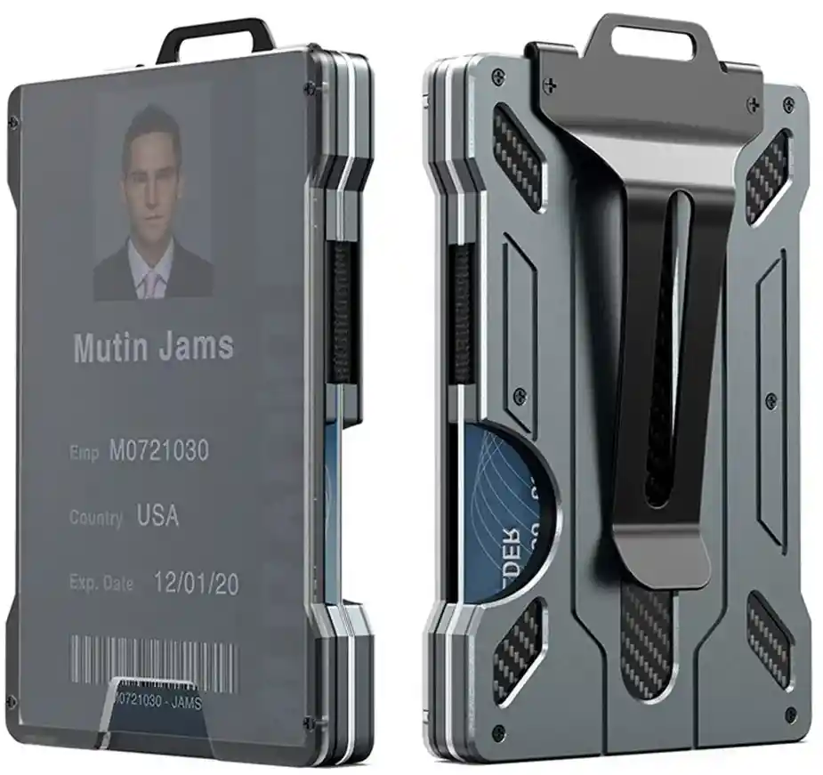 portatarjetas de identificación con aspecto elegante y fresco, cuerpo delgado y ligero, diseño elegante y estructura de metal de alta calidad lo hacen más resistente. Debido a que sus tarjetas estarán rodeadas por el cuerpo metálico de esta billetera, la tecnología de bloqueo RFID incorporada protege sus tarjetas de crédito de los ladrones.