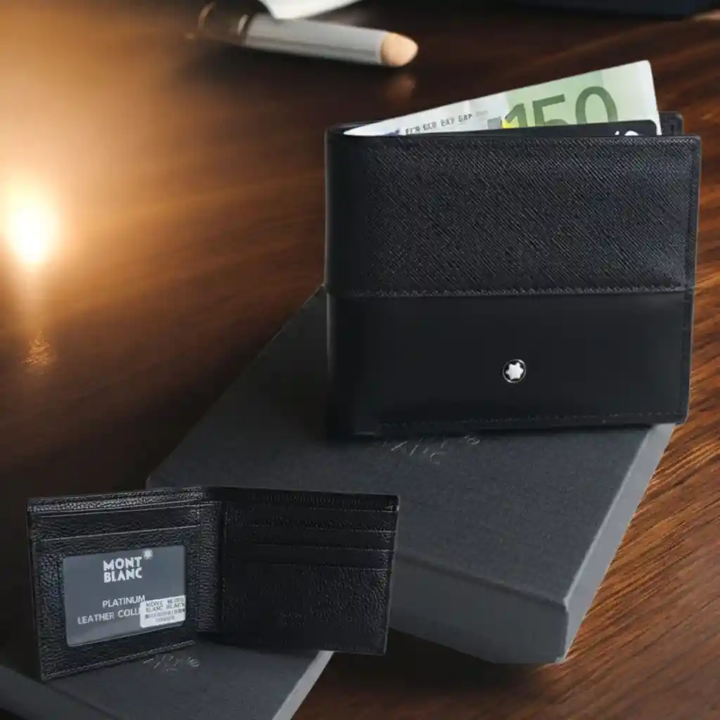 Billetera para hombre de alta calidad en color negro, con diseño elegante y sobrio. Cuenta con grabado decorativo y pines plateados que aportan un toque moderno y distintivo ✨. Fabricada en material resistente, ideal para el uso diario. Dispone de múltiples compartimentos para billetes, tarjetas y documentos, combinando funcionalidad y estilo 👔.