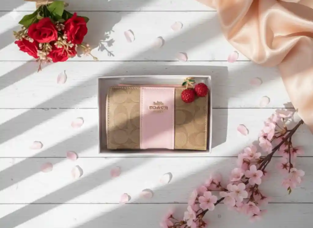 Billetera monedero para mujer (dama) de alta calidad en color beige, con delicados detalles rosados que aportan un estilo femenino y elegante 🍒. Incluye grabado decorativo y pines con motivo de fruta cereza, brindando un toque original y encantador. Fabricada en material resistente, ideal para el uso diario. Cuenta con compartimentos para monedas, billetes y tarjetas, combinando funcionalidad y buen gusto 💼.