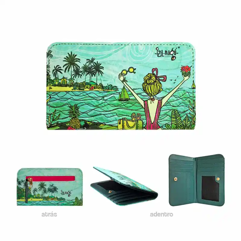 Billetera Verano. Material: Eco Cuero – Sintético. Ilustración Exclusiva de la Marca. Tamaño: 15 X 9 cm.