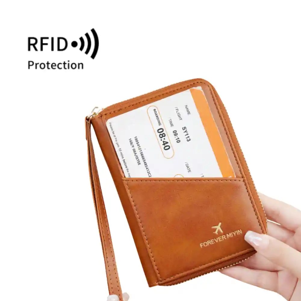 AL0000002160 MÚLTIPLES COMPARTIMENTOS ORGANIZADORES Cuenta con 1 bolsillo para pasaporte, 4 ranuras para tarjetas, 1 bolsillos externo, 1 porta bolígrafos y 2 ranuras para tarjetas SD. El bolsillo frontal exterior permite acceso rápido a documentos en aeropuertos y controles migratorios. PROTECCIÓN RFID ANTIRROBO Incorpora tecnología avanzada de bloqueo RFID que protege tus tarjetas contra escaneos no autorizados, manteniendo segura tu información personal durante viajes nacionales e internacionales. MATERIAL RESISTENTE Y ELEGANTE Fabricado en cuero vegano de alta calidad con cremalleras reforzadas y muñequera resistente a desgarros. Diseño funcional, duradero, moderno y unisex, ideal para uso frecuente. ESPACIOSO Y LIGERO Permite organizar pasaportes, tarjetas, documentos y accesorios en un solo lugar sin añadir peso innecesario. Perfecto para viajes familiares o de negocios. IDEAL PARA VIAJES SEGUROS Un organizador indispensable para aeropuertos, estaciones, autobuses, trenes, festivales y mercados concurridos. Diseñado para mantener todos tus documentos protegidos y al alcance. INCLUYE: 1 Organizador de pasaportes con bloqueo RFID