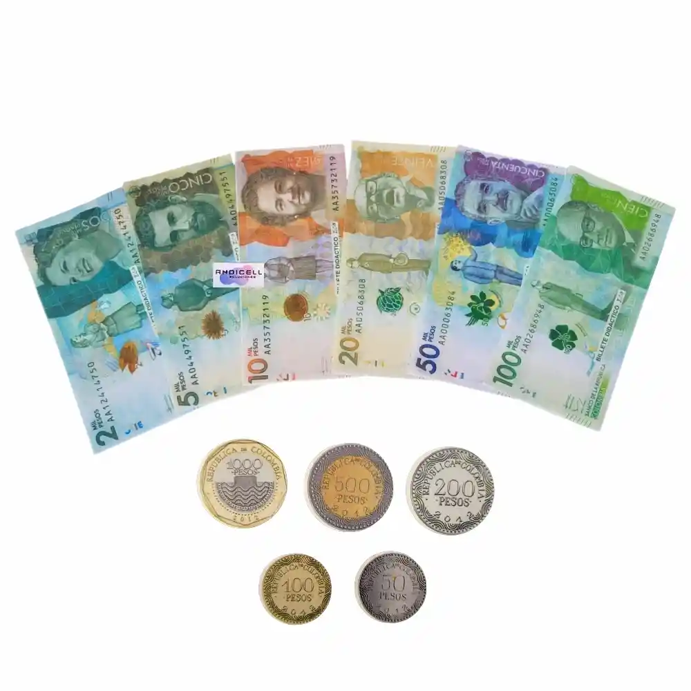 Kit Billetes Didácticos Surtidos + Monedas Peso Colombiano Incluye: 80 unidades de billetes surtidos y 80 unidades de monedas de cartón surtidas - Mejora la comprensión del sistema monetario colombiano - Facilita el aprendizaje de conceptos financieros y matemáticos - Ofrece una experiencia práctica y visualmente estimulante - Ideal para el hogar, la escuela o cualquier entorno educativo Denominaciones billetes incluidas: - 100 mil pesos - 50 mil pesos - 20 mil pesos - 10 mil pesos - 5 mil pesos - 2 mil pesos Denominaciones monedas incluidas: - 100 pesos - 200 pesos - 500 pesos - 1000 pesos NOTA: No son billetes de utilería (no son similares a un billete real), son billetes didácticos con marca de agua.