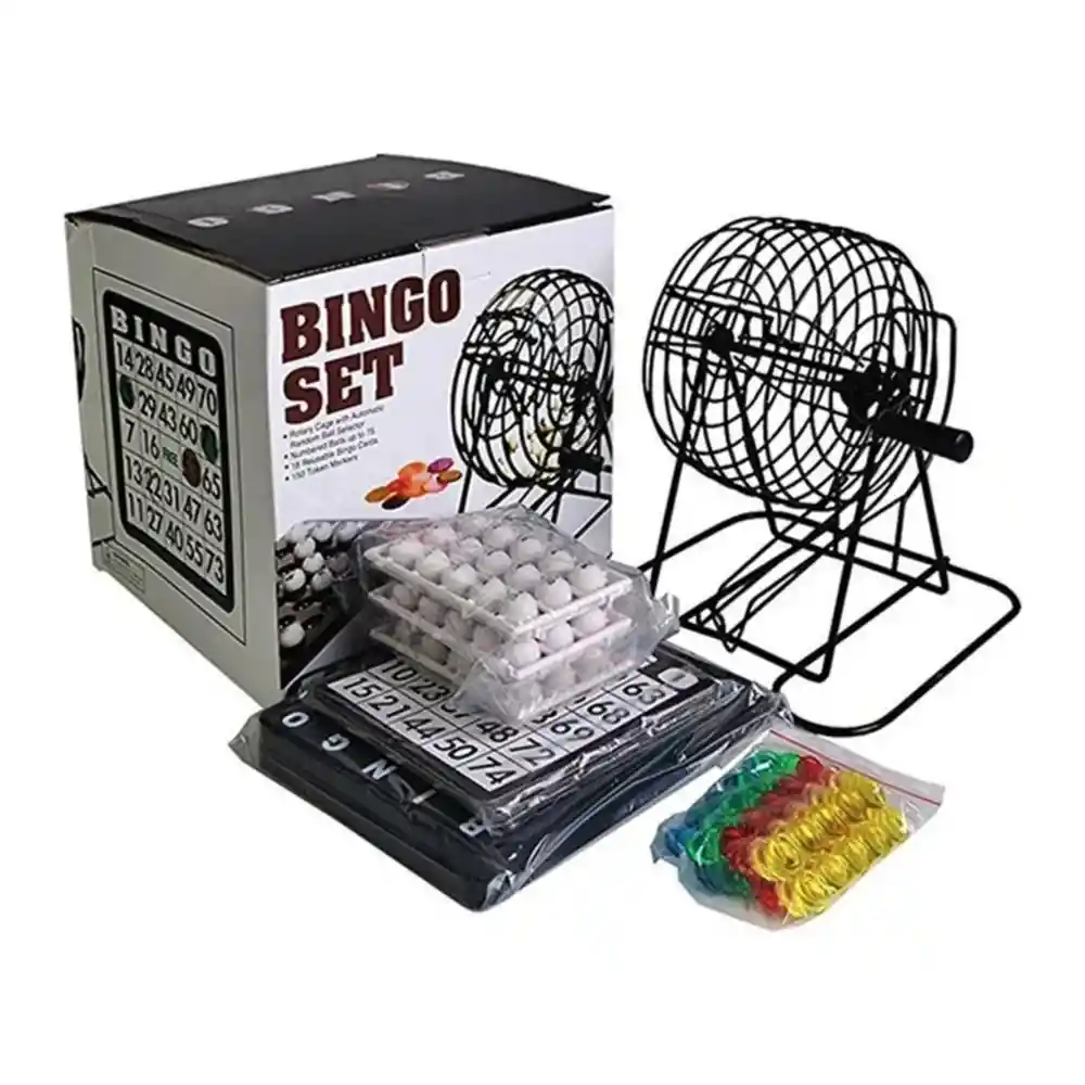 Juego divertido: bingo adecuado para niños y adultos; para 2 a 18 jugadores; instrucciones en inglés. Para jugar con los amigos: juego de bingo para la próxima excursión o viaje con la familia o amigos. Ideal para transportar: bingo manual pequeño que ocupa poco espacio; cartones reutilizables con fichas. Características: bombo con peana estable y manivela; tablero para dejar las bolas; fichas para tapar. Detalles: bombo metal 20 x 17,5 x 21,5 cm, pesa 1 kg; 75 bolas; 2 tableros; 18 cartones; 150 fichas. Contenido del paquete: 1-Set bingo.
