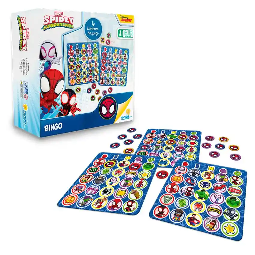 Bingo Spidey - Juego de Mesa Infantil Incluye: - 6 tableros - 1 tablero maestro - 50 tokens maestros - 150 tokens - 1 bolsa de almacenamiento Marca: Ronda Colección: Spidey - Sorprendentes Amigos Edad recomendada: 5+ El Bingo Spidey combina diversión y aprendizaje en un juego clásico con los superhéroes favoritos, ideal para compartir en familia o con amigos mientras los niños desarrollan habilidades clave. Beneficios del juego: - Potencia la concentración, memoria y observación. - Refuerza la imaginación y la resolución de problemas. - Estimula las capacidades motoras y sensoriales. - Fomenta la toma de decisiones y la elaboración de estrategias. - Promueve la socialización y el trabajo en equipo. Un juego ideal para tardes de diversión donde los niños no solo se entretienen, sino que también fortalecen habilidades mientras comparten la emoción de ser los primeros en gritar… ¡Bingo!