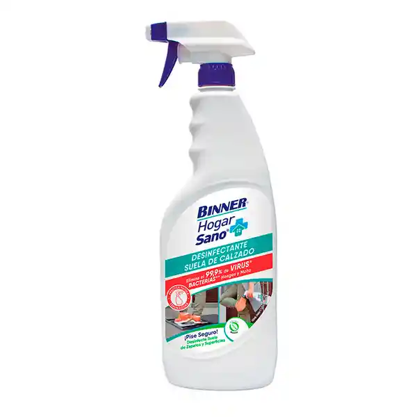 Binner Hogar Sano Desinfectante Sin Cloro Use en Suela de Calzado, Elimina el 99,9% de Virus* Como Rotavirus e Influenza A(H1N1) Causantes de la Gripe y Entre Otras Enfermedades Respiratorias. También Elimina Bacterias**, Hongos y Moho Tales Como Escherichia Coli, Staphylococcus Aureus, Bacillus Subtilis y Candida Albicans, Altamente Perjudiciales Para la Salud. Sus Propiedades Higienizantes Previenen Que Los Virus y Las Bacterias Que se Encuentran Adheridas en la Suela de Los Zapatos Entren a su Hogar. Aplica Para Todo Tipo de Material.