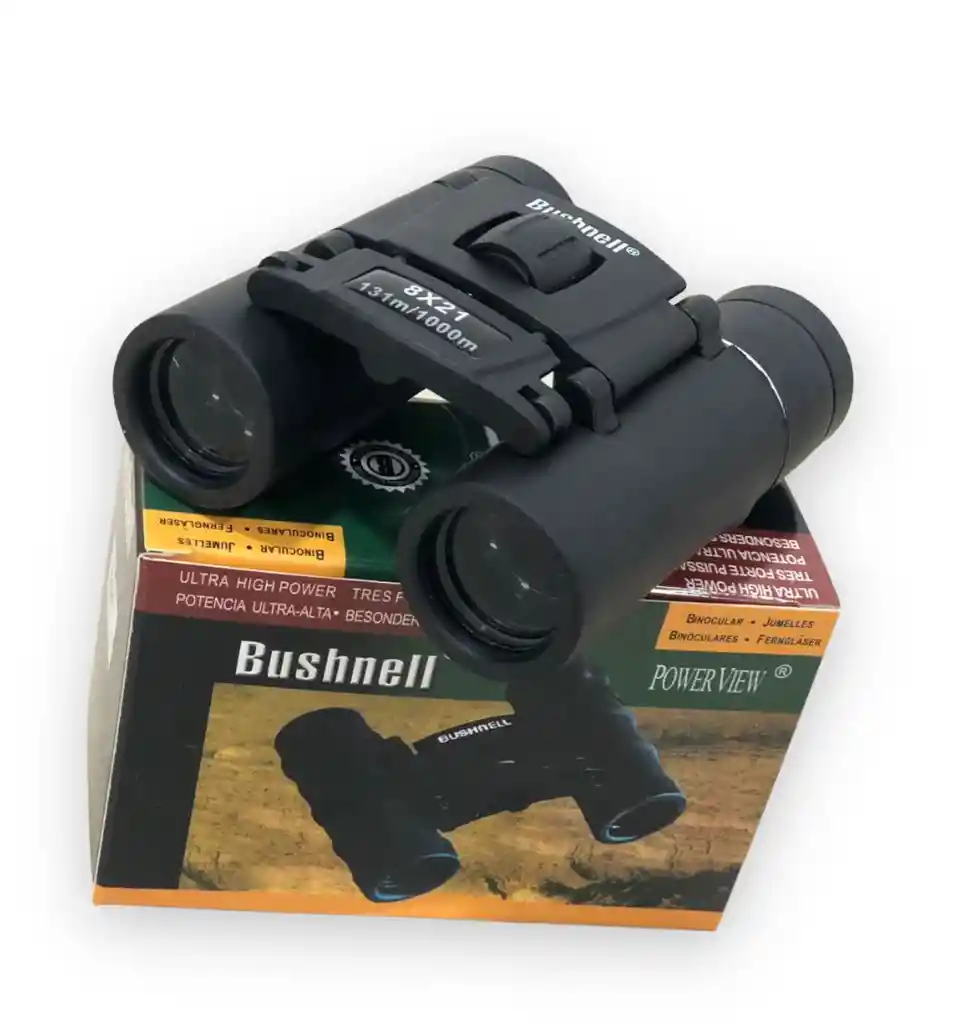 Binocular Bushnell Powerview 8x21 Ref 132514 BINOCULAR BUSHNELL 8x21 132514 POWERVIEW Binoculares plegables que caben en un bolsillo o en una cartera. 8x aumentos. 21 mm de lente. Campo de visión: 378 pies a 1.000 yardas - 126 metros a 1.000 metros. Peso: 7 OZ - 195 gramos. NO es resistente al agua. NO es resistente al empañamiento. Sistema de prisma: recto (roof). PrismasBK7. Distancia mínima de enfoque: 6,4 metros. Recubrimientos anti reflectivos tipo completo (fully).