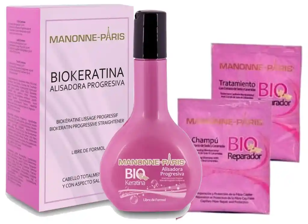 BIOKERATINA ALISADO PROGRESIVO -LIBRE DE FORMOL CABELLO COMPLETAMENTE LISO Y CON ASPECTO SALUDABLE INCLUYE SACHET DE CHAMPU Y TRATAMIENTO BIOREPARADOR Y FOLLETO CON DESCRIPCIONES Descripción: Biokeratina Alisadora Progresiva es un producto desarrollado con nanopartículas de aminoácidos derivador de la keratina, que es la principal proteína del cabello. Estas nanoparticulas proporcionan un alisado inteligente que es activado por acción de calor (termoactivación). Los aminoácidos derivados de la keratina son totalmente compatibles con la fibra capilar y generan un cambio en la estructura química del cabello aportando un aspecto totalmente liso, sin friz y con volumen controlado, además lo nutre y humecta, lo que da como resultado un cabello fácil de peinar con un aspecto totalmente saludable y un excelente brillo. Esta exclusiva formula de última generación, permite el relajamiento de las ondas del cabello y la reparación de los daños causados por efectos del medio ambiente o por procesos químico previos, debido a su alta compatibilidad con la fibra capilar. Resultados: - Cambio temporal de la estructura de la fibra del cabello (cabello totalmente liso). - Cabello sedoso, natural y brillante. - Penetra la fibra capilar sin la necesidad de abrir la cutícula, por lo tanto, no ocasiona daños al cabello. - Repara la fibra capilar sensibilizada a causa de tratamientos químicos previos o por efectos del medio ambiente. - Disminuye el friz - Control del volumen. Modo de empleo: Paso 1: Lavar el cabello con champú Bioreparador de Manonne- Paris (Incluido sachet 30ml) Paso 2: Enjuagar completamente. Paso 3: Eliminar el exceso de humedad en un 90%, solo con secador (sin cepillo) Paso 4: Aplicar BioKeratina Alisado Progresivo, mechón por mechón, hasta completar el total del cabello, pasar la peinilla para distribuir bien el producto. Paso 5: Dejar el producto en contacto de 20 a 30 minutos. Cabellos rizados 20min. Cabellos crespos 30min. Paso 6: Sin enjuagar, retirar el exceso de producto con la ayuda de una peinilla, secar el cabello (Con secador) tomando mechón por mechón hasta completar todo el cabello Paso 7: Planchar el cabello a una temperatura no menor a 200°C para cabellos con baja porosidad, en caso contrario disminuir la temperatura y realizar este proceso mechón por mechón hasta completar todo el cabello. Paso 8: Dejar actuar el producto por 15 min. Paso 9: Lavar el cabello con Champú Manonne-Paris, enjuagar completamente. Paso 10: Aplicar tratamiento capilar Bioreparador de Manonne-Paris, dejar actuar por 5 minutos y enjuagar completamente. (Tratamiento de 30ml incluido) Paso 11: Eliminar el exceso de humedad y luego secar hasta un 90%(Con secador) Paso 12: Cepillar el cabello con secador y cepillo. Si desea planchar. Paso 13: No colocar ningún tipo de pinzas, horquilla u otro accesorio para sostener el cabello durante los primeros 5 días después del proceso de alisado para evitar marcas en el mismo. Paso 14: El cabello se puede lavar 5 días después de realizar el proceso. NSOC46777-12C Colombia Acerca de MANONNE-PARIS MANONNE-PARIS es una empresa de origen francés con más de 10 años de trayectoria en la comercialización de productos de cosmética capilar en Latinoamérica. Hemos confiado la fabricación de nuestros productos en el prestigioso laboratorio COSMETIC FRANCE LTDA, con base en Bogotá (Colombia), dado su liderazgo y posicionamiento en la región, sus altísimos estándares de calidad, su tecnología de vanguardia y la amplia experticia y capacidad de innovación de su equipo científico.