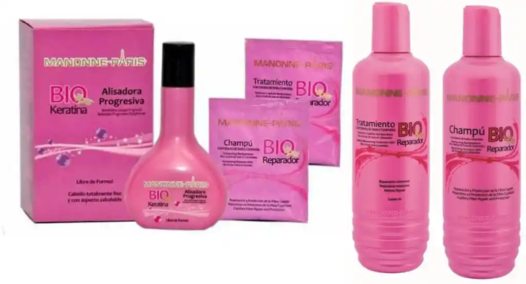 KIT: BIOKERATINA ALISADO PROGRESIVO -LIBRE DE FORMOL CABELLO COMPLETAMENTE LISO Y CON ASPECTO SALUDABLE INCLUYE BOTELLA DE CHAMPU 320ML Y TRATAMIENTO BIOREPARADOR 320ML Y FOLLETO CON DESCRIPCIONES Descripción: Biokeratina Alisadora Progresiva es un producto desarrollado con nanopartículas de aminoácidos derivador de la keratina, que es la principal proteína del cabello. Estas nanoparticulas proporcionan un alisado inteligente que es activado por acción de calor (termoactivación). Los aminoácidos derivados de la keratina son totalmente compatibles con la fibra capilar y generan un cambio en la estructura química del cabello aportando un aspecto totalmente liso, sin friz y con volumen controlado, además lo nutre y humecta, lo que da como resultado un cabello fácil de peinar con un aspecto totalmente saludable y un excelente brillo. Esta exclusiva formula de última generación, permite el relajamiento de las ondas del cabello y la reparación de los daños causados por efectos del medio ambiente o por procesos químico previos, debido a su alta compatibilidad con la fibra capilar. Resultados: - Cambio temporal de la estructura de la fibra del cabello (cabello totalmente liso). - Cabello sedoso, natural y brillante. - Penetra la fibra capilar sin la necesidad de abrir la cutícula, por lo tanto, no ocasiona daños al cabello. - Repara la fibra capilar sensibilizada a causa de tratamientos químicos previos o por efectos del medio ambiente. - Disminuye el friz - Control del volumen. Modo de empleo: Paso 1: Lavar el cabello con champú Bioreparador de Manonne- Paris (Incluido sachet 30ml) Paso 2: Enjuagar completamente. Paso 3: Eliminar el exceso de humedad en un 90%, solo con secador (sin cepillo) Paso 4: Aplicar BioKeratina Alisado Progresivo, mechón por mechón, hasta completar el total del cabello, pasar la peinilla para distribuir bien el producto. Paso 5: Dejar el producto en contacto de 20 a 30 minutos. Cabellos rizados 20min. Cabellos crespos 30min. Paso 6: Sin enjuagar, retirar el exceso de producto con la ayuda de una peinilla, secar el cabello (Con secador) tomando mechón por mechón hasta completar todo el cabello Paso 7: Planchar el cabello a una temperatura no menor a 200°C para cabellos con baja porosidad, en caso contrario disminuir la temperatura y realizar este proceso mechón por mechón hasta completar todo el cabello. Paso 8: Dejar actuar el producto por 15 min. Paso 9: Lavar el cabello con Champú Manonne-Paris, enjuagar completamente. Paso 10: Aplicar tratamiento capilar Bioreparador de Manonne-Paris, dejar actuar por 5 minutos y enjuagar completamente. (Tratamiento de 30ml incluido) Paso 11: Eliminar el exceso de humedad y luego secar hasta un 90%(Con secador) Paso 12: Cepillar el cabello con secador y cepillo. Si desea planchar. Paso 13: No colocar ningún tipo de pinzas, horquilla u otro accesorio para sostener el cabello durante los primeros 5 días después del proceso de alisado para evitar marcas en el mismo. Paso 14: El cabello se puede lavar 5 días después de realizar el proceso. NSOC46777-12C Colombia Acerca de MANONNE-PARIS MANONNE-PARIS es una empresa de origen francés con más de 10 años de trayectoria en la comercialización de productos de cosmética capilar en Latinoamérica. Hemos confiado la fabricación de nuestros productos en el prestigioso laboratorio COSMETIC FRANCE LTDA, con base en Bogotá (Colombia), dado su liderazgo y posicionamiento en la región, sus altísimos estándares de calidad, su tecnología de vanguardia y la amplia experticia y capacidad de innovación de su equipo científico.