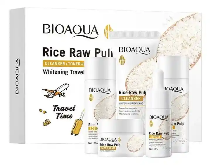 Kit Viajero Bioaqua Rice Raw Pulp (Arroz) – Rutina Facial x 5 Optimiza tu rutina de cuidado facial con el Kit BIOAQUA Rice Raw Pulp (Arroz) en formato x5 pasos, ideal para llevar de viaje o para iniciar una rutina completa de limpieza + hidratación + luminosidad con productos de la misma línea. Este set está compuesto por limpiador, tónico, esencia/sérum, loción/emulsión y crema facial. ¿QUÉ INCLUYE? Set x5 de la línea Rice Raw Pulp, con los pasos esenciales de skincare: • Limpiador facial (Cleanser) 30g • Tónico facial (Toner) 30ml • Esencia / sérum (Essence) 10ml • Loción / emulsión hidratante (Lotion) 30ml • Crema facial (Face cream) 15ml BENEFICIOS • Enfocado en hidratación y sensación de piel más suave y confortable. • Ayuda a mejorar la apariencia de luminosidad y aspecto más uniforme con el uso constante. • Rutina completa de 5 pasos: prepara la piel desde la limpieza hasta el sellado final con crema. COMO USARLO (ORDEN RECOMENDADO) Mañana y/o noche: 1. Limpiador: masajea sobre el rostro húmedo y enjuaga. 2. Tónico: aplica con manos o algodón. 3. Esencia/sérum: 2–3 gotas y masaje suave. 4. Loción/emulsión: capa ligera para hidratar. 5. Crema facial: finaliza para sellar la hidratación. De día: complementa con protector solar.