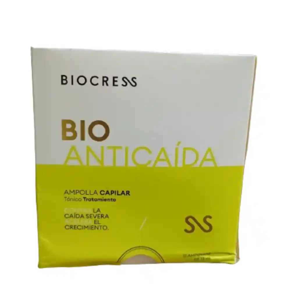 BIOCRESS TÓNICO BIOANTICAÍDA CAJA X 12 AMPOLLETAS 13ml C/U Fórmula innovadora con extractos naturales de cress, argania espinosa, proteínas Q10, colágeno hidrolizado y microproteínas oro, que fortalece, previene la caída, acelera el crecimiento y da brillo intenso.