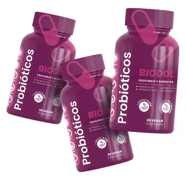 Biodol ProbióTicos Descripción del producto BIODOL Probióticos es un tratamiento natural en cápsulas vegetales que combina un complejo probiótico de nueva generación con prebióticos, extractos funcionales y micronutrientes. Está formulado para fortalecer la salud digestiva, inmunológica y urinaria, apoyando el equilibrio de la microbiota y la protección natural frente a infecciones.Formato: frasco con 30 cápsulas vegetales.Dosis recomendada: 1 cápsula diaria (después del desayuno o después de la cena).Dirigido a: personas que desean mejorar su salud digestiva, reforzar defensas y mujeres que buscan prevenir y aliviar molestias urinarias. Problemática que resuelve Los desequilibrios en la microbiota intestinal y vaginal pueden causar: Digestión lenta, inflamación y gases. Disminución de defensas y mayor susceptibilidad a resfriados o infecciones. Infecciones urinarias recurrentes y molestias asociadas. Desequilibrios que afectan el bienestar íntimo. Estos problemas generan incomodidad, baja energía, disminución del rendimiento y sensación de vulnerabilidad. BIODOL Probióticos ofrece una solución integral para proteger y fortalecer el organismo desde dentro. Ingredientes activos (por porción diaria) Complejo Probiótico (Lactobacillus rhamnosus GR-1, L. reuteri RC-14, L. crispatus, L. plantarum, B. lactis) – 5 billones CFU D-Manosa – 250 mg Prebiótico (GOS / Inulina) – 150 mg Arándano rojo (extracto) – 60 mg Vitamina C – 30 mg Vitamina D₃ – 400 UI Zinc (bisglicinato) – 2.5 mg Acción resumida de cada ingrediente Complejo Probiótico (5 cepas): Restaura la microbiota intestinal y vaginal, fortalece la inmunidad y protege contra infecciones. D-Manosa: Previene la adhesión bacteriana en vías urinarias, ayudando a reducir infecciones urinarias recurrentes. Prebióticos (GOS/Inulina): Alimentan y potencian la acción de los probióticos, promoviendo un microbioma saludable. Arándano rojo: Potente antioxidante y protector urinario; contribuye a la prevención de cistitis. Vitamina C: Refuerza las defensas, protege contra radicales libres y favorece la absorción de nutrientes. Vitamina D₃: Apoya la inmunidad y junto al zinc contribuye al equilibrio de defensas. Zinc (bisglicinato): Mejora la respuesta inmune, favorece la cicatrización y contribuye al bienestar celular. Beneficios del producto Equilibra la microbiota intestinal y vaginal. Favorece la digestión saludable y reduce inflamación. Fortalece el sistema inmune. Apoya la prevención de infecciones urinarias. Mejora el bienestar íntimo y digestivo. Antioxidante natural para protección celular. 100% vegano, seguro y libre de químicos agresivos. Causas principales del problema Uso frecuente de antibióticos. Estrés crónico y dieta desequilibrada. Consumo alto de azúcares y ultraprocesados. Desequilibrios hormonales. Exposición a contaminantes ambientales. Preguntas frecuentes 1. ¿En cuánto tiempo se sienten los beneficios?La mejoría digestiva puede notarse en 1–2 semanas; para defensas y microbiota íntima, se recomienda uso continuo de mínimo 2–3 meses. 2. ¿Se puede tomar junto a antibióticos?Sí, pero idealmente se debe espaciar el consumo (tomar el probiótico 2–3 horas después del antibiótico). 3. ¿Ayuda en la prevención de infecciones urinarias?Sí, gracias a la combinación de probióticos, D-Manosa y arándano rojo que protegen vías urinarias. 4. ¿Tiene efectos secundarios?Generalmente es bien tolerado. En algunos casos puede presentarse leve distensión abdominal los primeros días mientras la microbiota se adapta. 5. ¿Se puede tomar a largo plazo?Sí, es un tratamiento seguro para consumo diario y prolongado. Instrucciones de uso Dosis: 1 cápsula diaria (después del desayuno o después de la cena). Presentación: 30 cápsulas vegetales. Duración: 30 días. Certificaciones o normativas cumplidas Producto con registro homeopático R1737/2005 SDO 61372. Elaborado en una farmacia homeopática, supervisada por la Secretaría de Salud y bajo estrictas normas de manufactura y sanidad. Libre de azúcar, maltodextrina, parabenos, gluten y GMO. 100% vegano.
