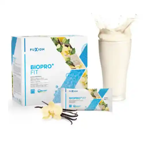 Fusión Nutracéutica: BioProtein con Colostrum + Aminoácidos + Tamarindo Malabar + Prolibra + Vitaminas + Calcio Lácteo. Delicioso batido a base de la proteína de la más alta calidad, creada y patentada por FuXion para ayudarte a conseguir el peso ideal, acelerando el metabolismo y nutriendo cada célula de tu cuerpo. Batido proteico sabor vainilla francesa, con 100% de disponibilidad y bajo en calorías. Hecho en base a BioProtein con Colostrum® (fórmula proteica patentada por Fuxion), enriquecida con aminoácidos, Tamarindo Malabar, micronutrientes y Prolibra®; ingredientes que promueven un óptimo metabolismo de las grasas, fomentando reducción de medidas, la formación de masa magra y músculos definidos. Sus componentes te permitirá: Acelerar el metabolismo, pasando de 3 a 5 en número de raciones de alimento al día; lo que permite eliminar grasa del cuerpo. Mejorar la nutrición a nivel celular, especialmente las fibras musculares si haces ejercicio, tonificando la masa muscular. Reducir la sensación de apetito gracias a la proteína, sumada a la acción de Prolibra. Beneficios BIOPRO+ FIT es un batido proteico que -junto al ejercicio- ayuda a acelerar el metabolismo del cuerpo, al pasar de 3 a 5 las raciones de alimentos al día y al reducir la sensación de apetito; sumada a la acción de Prolibra® que promueve la eliminación de grasa del cuerpo y la tonificación de la masa muscular.
