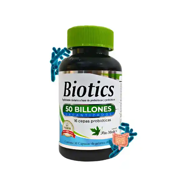 Compras (1) Frasco De Biotics Suplemento Dietario A Base De Prebióticos Y Probióticos Por 30 Capsulas Fito Medic´s Frasco De Biotics Prebióticos Y Probióticos Por 30 Capsulas Fito Medic´s * REGISTRO INVIMA SD2020-0004514 *Biotics Prebióticos y Probióticos: La flora intestinal se altera por varios factores, el mas frecuente es el consumo de antibióticos ya sea formulado por el medico o por automedicación. Los probióticos son alimentos o suplementos que contienen microorganismos vivos destinados a mantener o mejorar las bacterias "buenas" (micro biota normal) del cuerpo. Los prebióticos son alimentos (generalmente con alto contenido de fibra) que actúan como nutrientes para la micro biota humana. -50 Billones Garantizado -16 Cepas Probióticas *Biotics Prebióticos y Probióticos: La flora intestinal se altera por varios factores, el mas frecuente es el consumo de antibióticos ya sea formulado por el medico o por automedicación. Los probióticos son alimentos o suplementos que contienen microorganismos vivos destinados a mantener o mejorar las bacterias "buenas" (micro biota normal) del cuerpo. Los prebióticos son alimentos (generalmente con alto contenido de fibra) que actúan como nutrientes para la micro biota humana. -50 Billones Garantizado -16 Cepas Probióticas Biotics Probióticos & Prebióticos de Fito Medics es un suplemento nutricional diseñado para promover la salud digestiva y el bienestar general. Con 16 cepas de probióticos y prebióticos, este producto ofrece una potente dosis de 50 billones de CFU por porción, lo que lo convierte en una opción ideal para quienes buscan mejorar su flora intestinal. Este suplemento es libre de gluten y no contiene lactosa, lo que lo hace apto para personas con intolerancias alimentarias. Su formato en cápsulas facilita la ingesta diaria, permitiendo que se integre sin esfuerzo en tu rutina. Además, está recomendado para adultos a partir de 18 años, asegurando que los beneficios se dirijan a un público que busca cuidar su salud digestiva. Biotics Probióticos & Prebióticos no solo apoya la digestión, sino que también contribuye a fortalecer el sistema inmunológico. Al incorporar este suplemento en tu dieta, puedes experimentar una mejora en tu bienestar general, ayudando a mantener un equilibrio saludable en tu organismo. El envase en frasco garantiza la conservación de sus propiedades, y su peso de porción de 1 g asegura una dosificación precisa. Con un enfoque en la calidad y la eficacia, este producto es una excelente adición a tu estilo de vida saludable. Biotics: Tu aliado natural para un sistema digestivo equilibrado Descubre el poder de la salud intestinal con Biotics, un suplemento probiótico formulado para promover el bienestar digestivo y fortalecer tu sistema inmunológico. Con una combinación única de 16 cepas de los mejores probióticos, Biotics es la solución perfecta para quienes buscan mejorar su salud desde adentro. Beneficios clave: Equilibrio digestivo: Biotics está diseñado para restaurar y mantener la flora intestinal, ayudando a reducir la hinchazón, el malestar y otros problemas digestivos comunes. Fortalecimiento del sistema inmunológico: Un intestino sano es fundamental para un sistema inmunológico fuerte. Biotics ayuda a reforzar tus defensas naturales, manteniéndote protegido. Mejora de la absorción de nutrientes: Al optimizar la salud intestinal, Biotics favorece la absorción de vitaminas y minerales esenciales, contribuyendo a tu bienestar general. Apoyo emocional: Un intestino saludable puede influir en tu estado de ánimo. Biotics ayuda a mantener un equilibrio emocional, promoviendo el bienestar mental. ¿Por qué elegir Biotics? 16 cepas de probióticos de alta calidad: Biotics contiene una exclusiva mezcla de 16 cepas probióticas que han demostrado su eficacia en estudios clínicos, garantizando resultados óptimos. Fórmula libre de aditivos: Sin colorantes, saborizantes ni conservantes artificiales, nuestro producto es seguro y natural. Fácil de incorporar a tu rutina: Presentado en cápsulas fáciles de tragar, Biotics se integra sin esfuerzo en tu día a día. Cómo usarlo: Toma 1 cápsula al día, preferiblemente con una comida. Para obtener los mejores resultados, acompaña tu consumo con una dieta equilibrada y un estilo de vida activo. Transforma tu salud intestinal con Biotics. ¡Ordénalo hoy y siente la diferencia en tu bienestar diario!