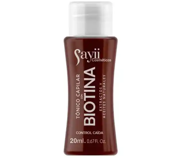 BIOTINA TÓNICO CAPILAR SAYII 20 ML : tónico capilar con Biotina Sayii es un tratamiento concentrado diseñado para detener la caída, fortalecer la fibra capilar y estimular el crecimiento saludable del cabello. Mejora la textura, aporta brillo, engrosa el cabello y regula la producción de sebo en el cuero cabelludo, siendo ideal para cabellos frágiles o con crecimiento lento. Principales Usos y Beneficios: * Anticaída: Ayuda a detener la caída del cabello y fortalece los folículos pilosos desde la raíz. * Crecimiento: Estimula el crecimiento de cabello nuevo y acelera el proceso. * Fortalecimiento: Engrosa y nutre la fibra capilar, reduciendo la fragilidad. Salud del Cuero Cabelludo: Regula la producción de grasa (sebo) y mejora la salud general del folículo. * Brillo y Textura: Mejora la apariencia, dejando el cabello más brillante y suave. * Modo de Uso: Se aplica directamente sobre el cuero cabelludo, masajeando suavemente con la yema de los dedos. No necesita enjuague y se recomienda su uso diario o constante para ver resultados, que suelen notarse tras varios meses.