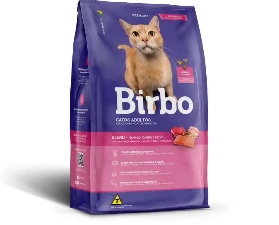 Birbo Gatos Blend, desarrollado para agradar al paladar exigente de los felinos Alimentación completa y balanceada, con ingredientes seleccionados, proteínas de origen animal y vegetal, enriquecida con vitaminas y minerales en niveles adecuados para los gatos adultos. Posee Taurina, aminoácido esencial para la dieta de los gatos que auxilia en el manutenimiento de la salud visual y cardíaca y contiene extracto de Yucca Schidigera, que actúa en nivel intestinal, reduciendo el olor de la materia fecal 30% proteína - 10% grasa Energía metabolizable: 3,750 kcal/kg