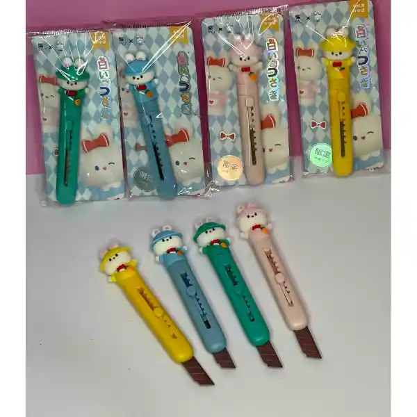Este artículo es un bisturí o cúter de arte con temática de conejos kawaii, ideal para manualidades y papelería. Diseño ergonómico con figuras de conejos en la parte superior. Disponible en varios colores: amarillo, azul, verde y rosa. Mecanismo retráctil para mayor seguridad al guardar la cuchilla. Cuchilla pequeña y afilada, perfecta para cortes precisos en papel o cartón fino.