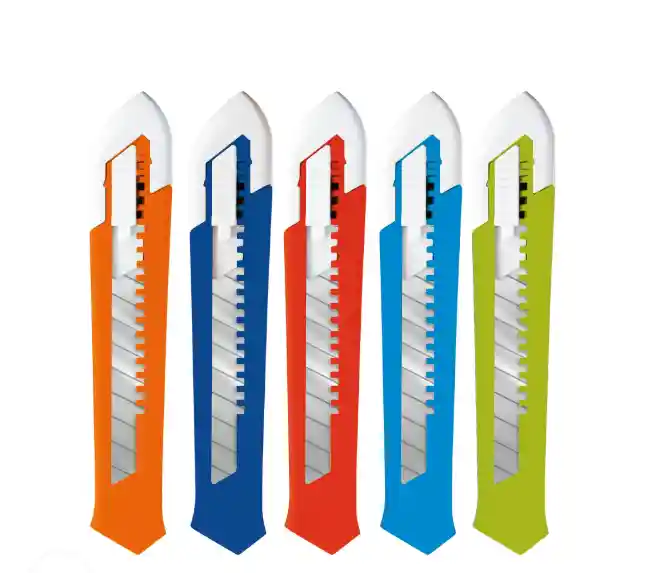 Bisturí de lujo grande Ancho de cuchilla 18 mm Novedoso sistema que evita el soporte o tapa se desprenda cuando esta en uso Plástico industrial de gran resistencia (ABS) Cuchilla en acero de carbono Ideal para la oficina e industrial Inner x 24 Unds. Caja x 480 Unds.