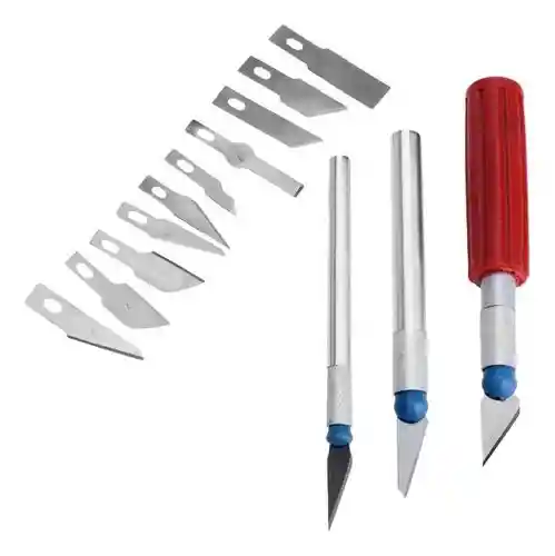 "Kit de herramientas de cuchillas de bisturí de Metal para tallado multifuncional corte de papel, película de plástico, textiles, arcilla polimérica, tallado en madera, escultura de barro, manualidades, uso de películas para teléfonos móviles, bricolaje CARACTERÍSTICAS DESTACADAS: *Se recomienda siempre utilizar con protección visual *Material: Acero *Paquete contiene: 3 Bisturís , 13 Cuchillas intercambiables"