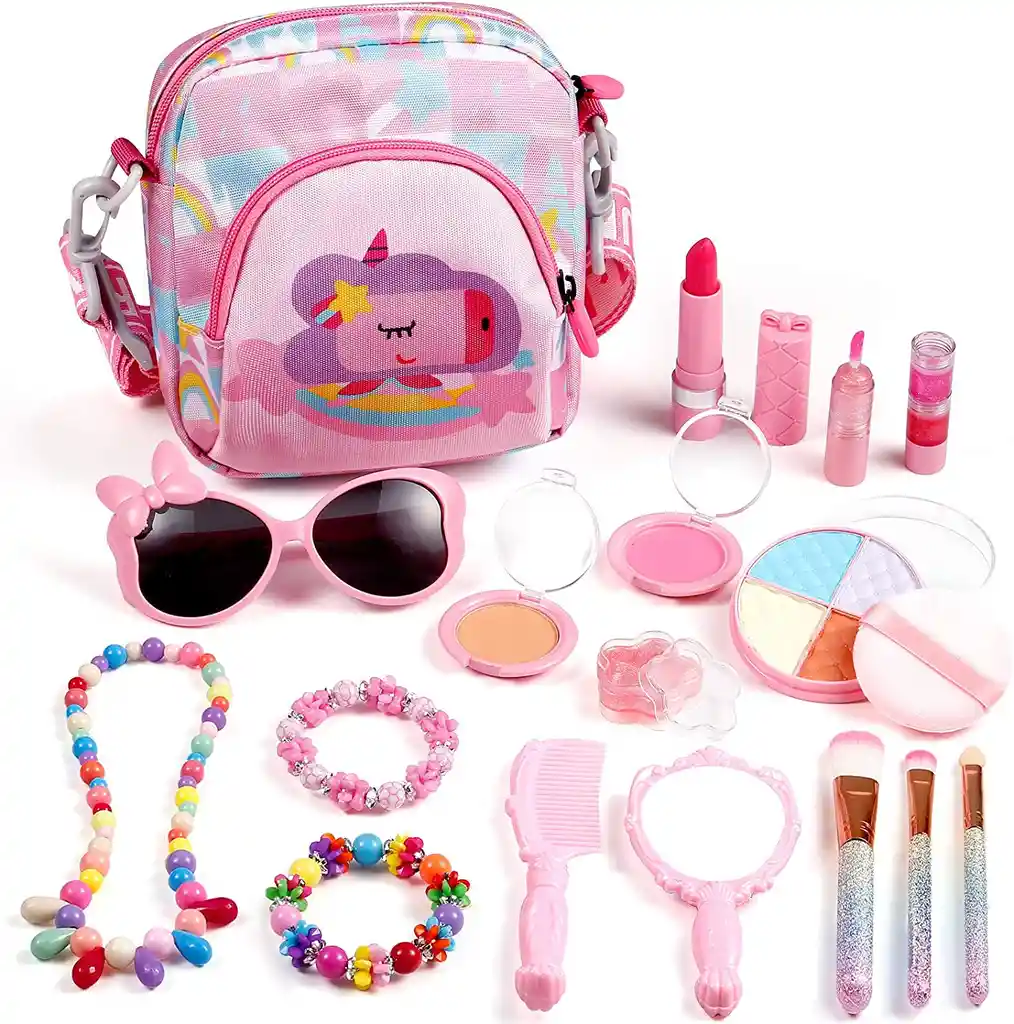 Juego de maquillaje real para niñas: este es un kit de maquillaje de 17 piezas, que incluye 1 espejo, 2 rubor, 1 peine, 1 lápiz labial, 1 gafas de sol, 1 sombra de ojos, 1 collar, 2 brillos de labios, 2 pulseras, 1 esponja de polvo, 3 pinceles, 1 bolsa de cosméticos con purpurina. Maquillaje perfecto para niñas de 3, 4, 5, 6, 7 años. Deja que los niños disfruten de la diversión de jugar con amigos o padres. Material seguro cosmético: nuestro maquillaje para niños está hecho de materiales seguros y de alta calidad, lavable, no tóxico, material a base de agua y suave para la piel. Pueden garantizar que tus hijos estén seguros para jugar. No utilices juguetes de maquillaje para niños en pieles sensibles. El proceso de juego es ideal para mejorar las habilidades prácticas y la imaginación. Regalo perfecto: las niñas pueden llevar nuestras gafas de sol UV400, collar y pulsera, luego pintar un hermoso maquillaje con nuestro maquillaje para niños, hará que tu pequeña princesa se vea elegante y refinada. Nuestro kit de maquillaje para niñas es el regalo perfecto para tu dulce princesa en juegos de simulación, casa de juegos, fiestas de princesa, citas de juego, principiantes, principiantes, fiestas de cumpleaños o artistas de maquillaje experimentados, primer kit de maquillaje para adolescentes, fiestas de cumpleaños, disfraces de princesa y actividades diarias de los niños.