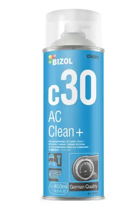 "Descripción del producto: Bizol AC Clean+ c30, limpia eficazmente los sistemas de aire acondicionado del hogar y del vehículo. Tiene un aroma a naranja, fresco, sutil y duradero. Se recomendia limpiar el sistema de aire acondicionado cada 6 meses. Adaptador especial incluido. Presentación: 400 ml Aplica a cualquier marca de automovil o de aire acondicionado. Ventajas: -Efecto rapido y de larga duración. -Elimina el mal olor del aire acondicionado. -Suave aroma a naranja. -Para sistemas de aire acondicionado de automóvil y del hogar. Aplicación: Aire Acondicionado (Vehiculos/Hogar/Otros) ¿Cómo utilizar el producto? El aerosol se debe utilizar a temperatura ambiente (la mejor temperatura para usarlo es entre 5°C y 30°C). El motor debe estar apagado, al igual que las instalaciones electricas (en el caso de su uso en el hogar), se debe agitar el aerosol y aplicar la espuma al condensador del aire acondicionado mediante el adaptador incluido. En vehículos se debe colocar el adaptador aproximadamente a 30 centimetros de la entrada de aire del sistema de aire acondicionado (la ubicación de la entrada del aire varia dependiendo de la marca), se vacia la lata por completo, en el caso del aire acondicionado de hogar se coloca directamente al condesador. Despues de la aplicación, no encender el motor ni las instalaciones electricas del hogar, esperar a que el producto se asiente. Se recomienda que el producto sea aplicado por un servicio especializado."