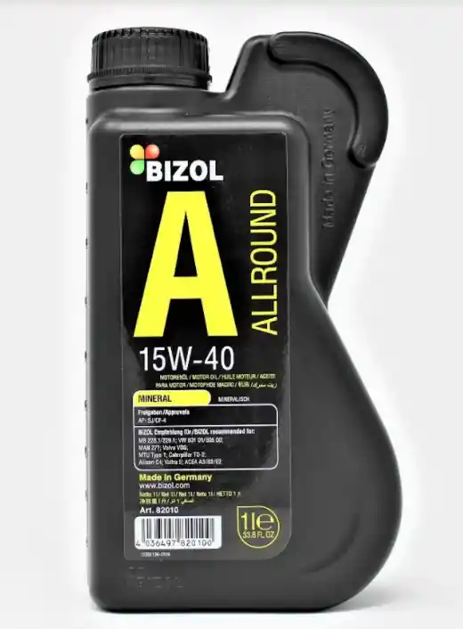 "Descripción del producto: Bizol Allround 15W-40, es un aceite de motor mineral moderno de alto rendimiento para uso durante todo el año en motores de gasolina y diesel (incluidos motores con turbocompresor y convertidor catalítico). Debido a la combinación de aditivos avanzados de última generación, garantiza una excelente protección contra la oxidación, el desgaste, una protección mejorada contra la formación de espuma y tiene propiedades anticorrosivas y purificantes. Presentación: 1 Lt. Vehículo: Livianos y Camionetas. Recomendación: Vehículos con edad mayor a 10 años, con menos de 200.000Km (o de uso no excesivo) Base: Mineral Motor: Gasolina/Diesel Ventajas: -Alta resistencia al envejecimiento. -Uso sobresaliente como aceite para todo el año. -Desarrollado para flotas combinadas. Clasificaciones y especificaciones: API SJ/CF-4 (Para motores desde 1996) MB 228.1/229.1 | VW 501 01/505 00 | MAN M 271 | Volvo VDS | MTU Type 1 | Caterpillar TO-2 | Allison C4 | Valtra E"