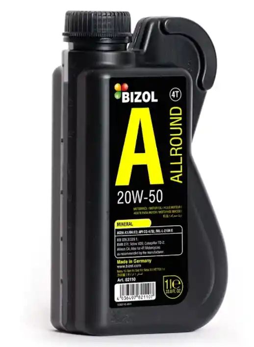 "Descripción del producto: Bizol Allround 20W-50, es un aceite de motor multigrado de alto rendimiento para motores de gasolina y diesel, es de uso universal, y entre otros, también es adecuado para flotas de vehículos comerciales. Presentación: 1 Lts. Vehículo: Livianos y Camionetas. Recomendación: Vehículos con edad mayor a 10 años y de uso excesivo (mayor a 200.000Km.) Base: Mineral Motor: Gasolina/Diesel Ventajas: -Uso universal de motores diesel y de gasolina (con o sin turbocompresor y/o refrigerador del aire de sobrealimentación). -Perdida por evaporación extremadamente baja. -Alta resistencia al envejecimiento y a los esfuerzos de corte. Clasificaciones y Especificaciones: ACEA A3 / B4 / E3 | API CG-4 / SL | MIL L-2104 E MB 228.3 / 229.1 | HOMBRE M 271 | Volvo VDS | Caterpillar TO-2 | Allison C4"