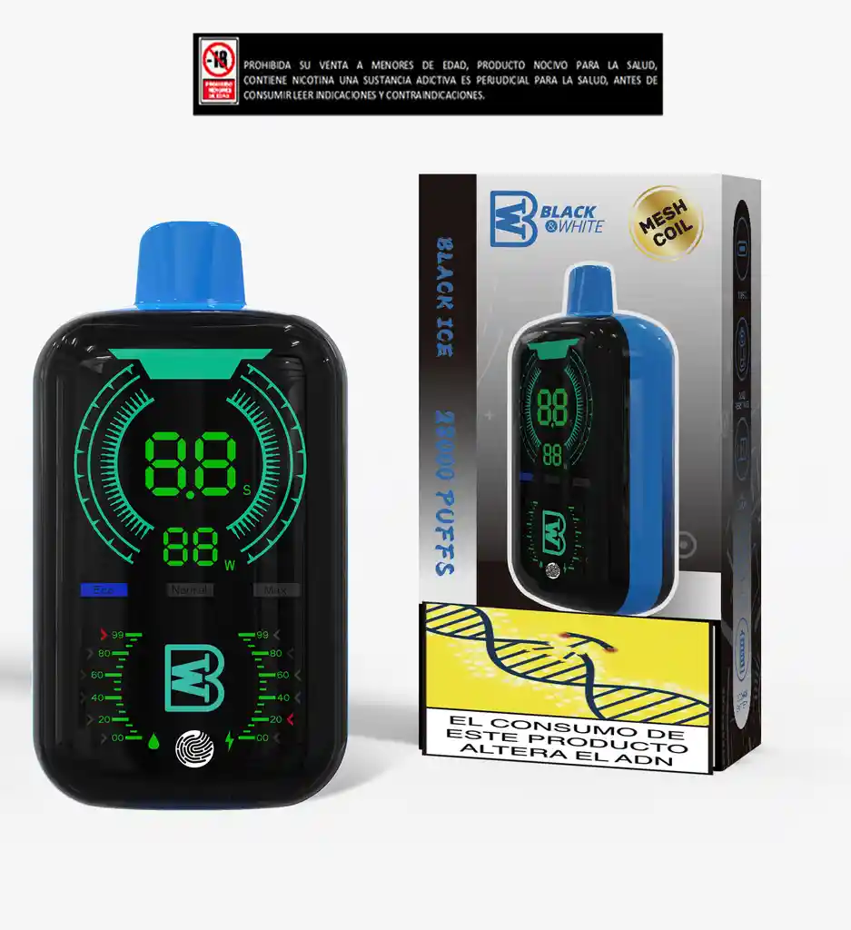 Descubre el equilibrio perfecto entre estilo y tecnología con nuestro vapeador Black White de 28.000 puffs. Su pantalla dinámica te mantiene al tanto de la batería y la esencia restante, para que disfrutes sin interrupciones. ⚫⚪ Diseño sofisticado ⚡ Duración extrema 📊 Control total en pantalla Haz de cada inhalación una experiencia sin límites. Este producto contiene nicotina de 5 %, es una sustancia adictiva. Prohibida su venta a menores de edad, es perjudicial para la salud, antes de consumir leer indicaciones y contraindicaciones.