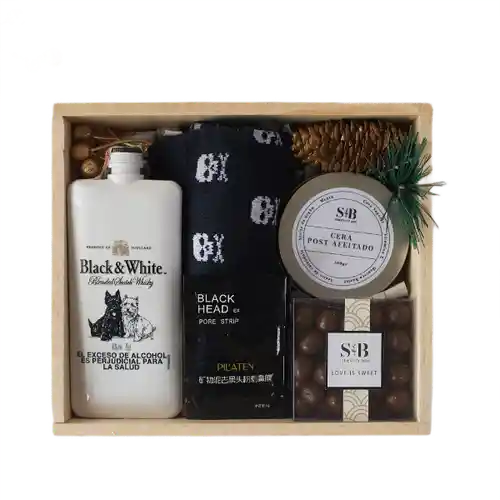 Whisky Black And White 2 Mascarillas De Puntos Negros Cera Post Afeitado Medias Estampadas Caja De Chocolates Caja De Madera Y Tarjeta De Navidad. | . Prohíbase El Expendio De Bebidas Embriagantes A Menores De Edad Ley 124 1994.