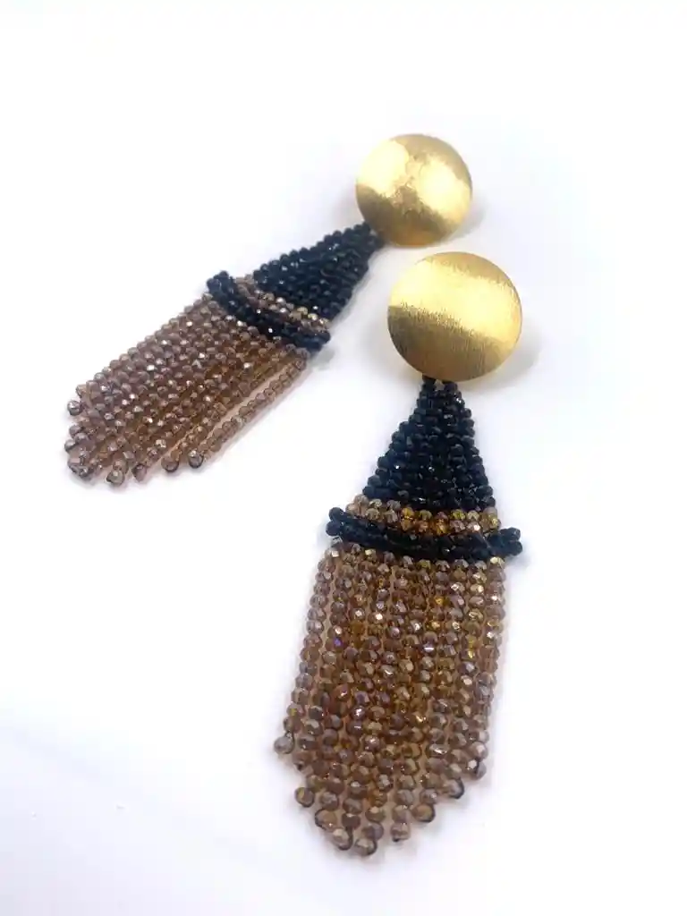 Estos aretes son el resultado de la creatividad de nuestro equipo que siempre deja su alma y cuerpo en cada creación que hacen con el fin de entregar productos de la mejor calidad. Son 100% hechos a mano en nuestro taller bordado en cristales de morano y topo de bronce con baño en oro. Cada una de nuestras piezas están inspiradas en la Mujer: “ Gracia y elegancia que atrae la atención de muchos con un estilo único que marca tendencia. “ Recomendaciones para el cuidado de cada pieza: • mantenerlos guardados en su cajita protectora • Evitar el contacto con agua, cremas u otros líquidos.