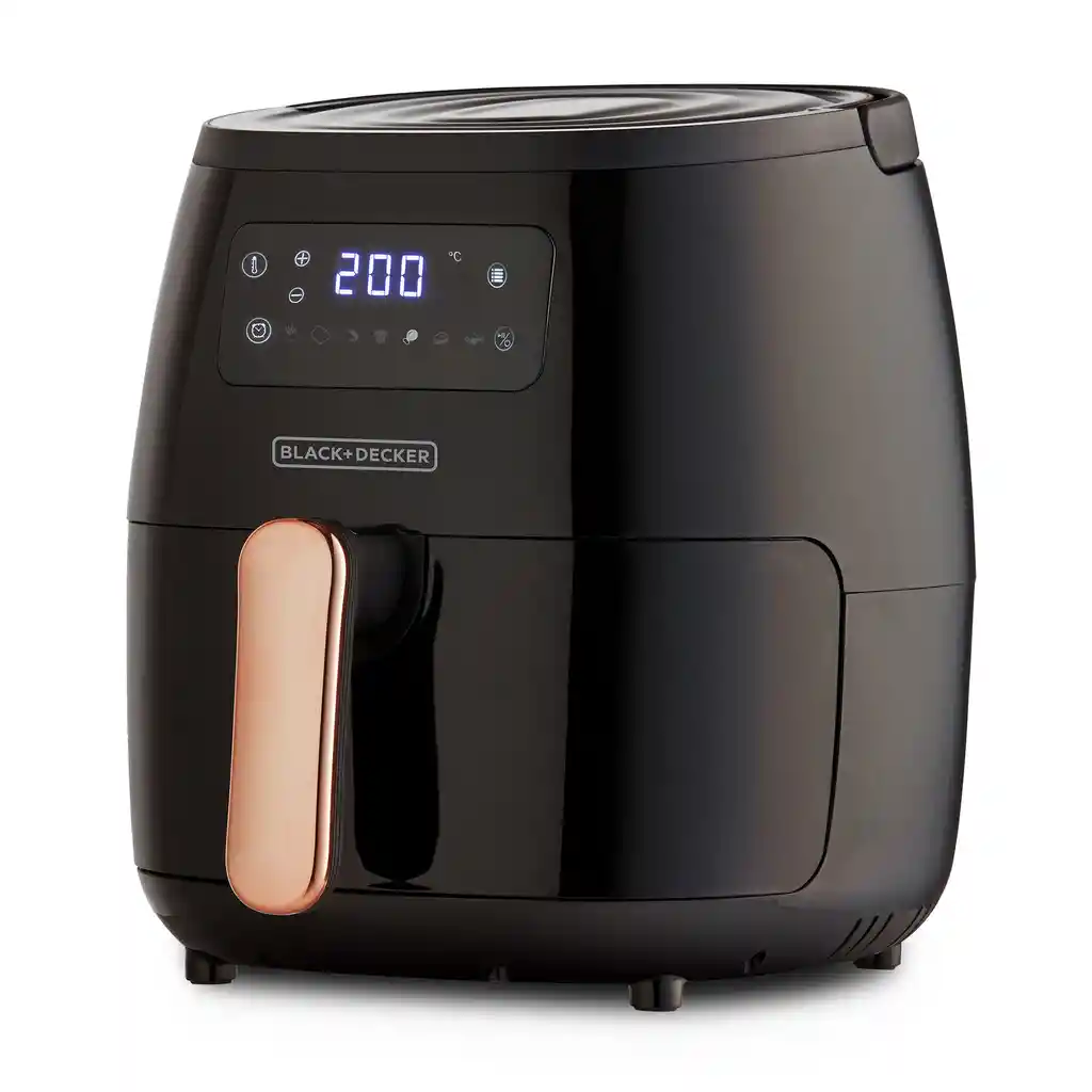 Cocina sin culpa y mas rápido con La Freidora de Aire Digital Saludable Extra Grande Cocina 45% más rápido de Black+Decker. - Controles Digitales - Canasta extra grande de 5 litros - Cesta con recubrimiento antiadherente desmontable - Control de temperatura de hasta 200° C - Reloj automático de 60 minutos con función de apagado automático - Limpieza fácil Mango frío al tacto - Garantía de 2 años