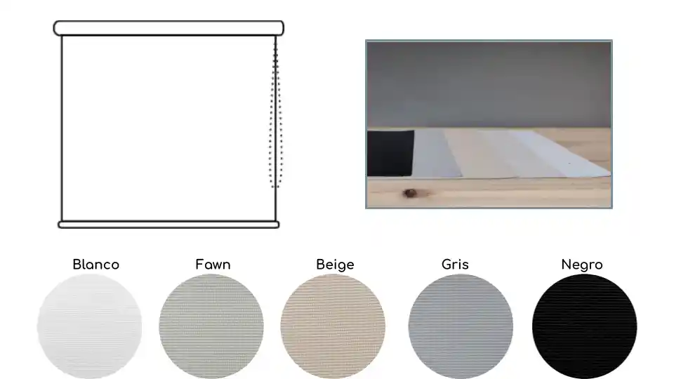 Enrollable Estándar Ancho: 115CM * Alto: 135CM - Mando o cadenita: Derecho o Izquierdo "Los blackouts son tejidos con un grado alto de opacidad, que nos permiten tener total privacidad y muy poca entrada de luz. Composición: 25% Fibra de Vidrio - 75% PVC Colores disponibles: Blanco, Negro, Gris, Fawn, Beige. (Favor indicarnos el color que desea) Las medidas del enrollable se pueden personalizar de acuerdo a cada ventana o espacio. Incluye soportes para techo o muro, sistema de accionamiento manual.
