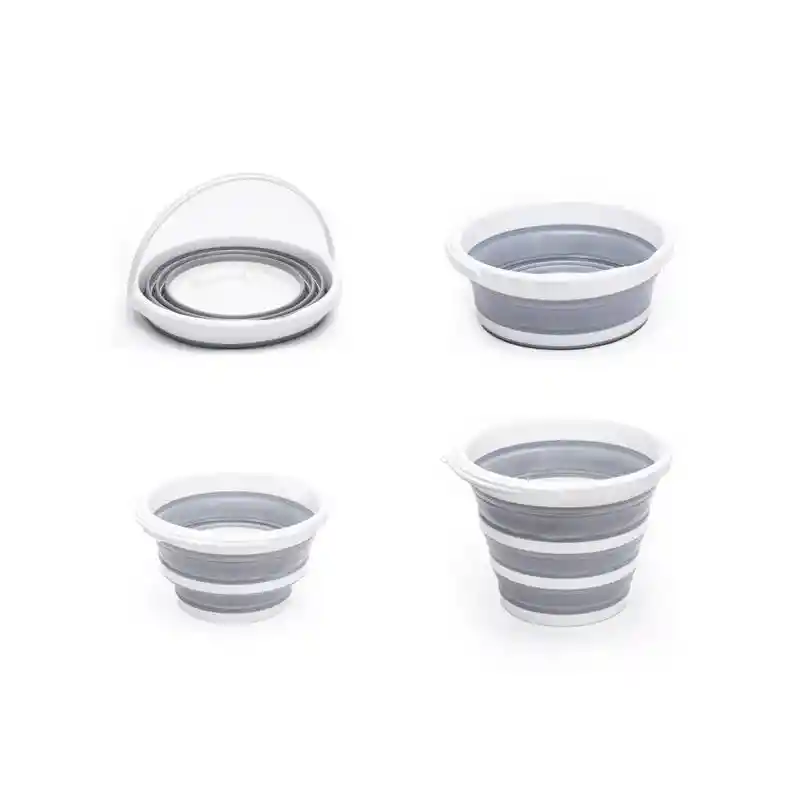 Balde plegable de silicona y plástico rígido de 10 litros de capacidad. Súper práctico para guardar plegado en espacios reducidos con pestaña para colgar. Color: Combinado Gris y Blanco Medidas: Alto: 25.5 cm (Plegado solamente 5cm) Diámetro base: 19.5 cm Diámetro boca: 31.5 cm