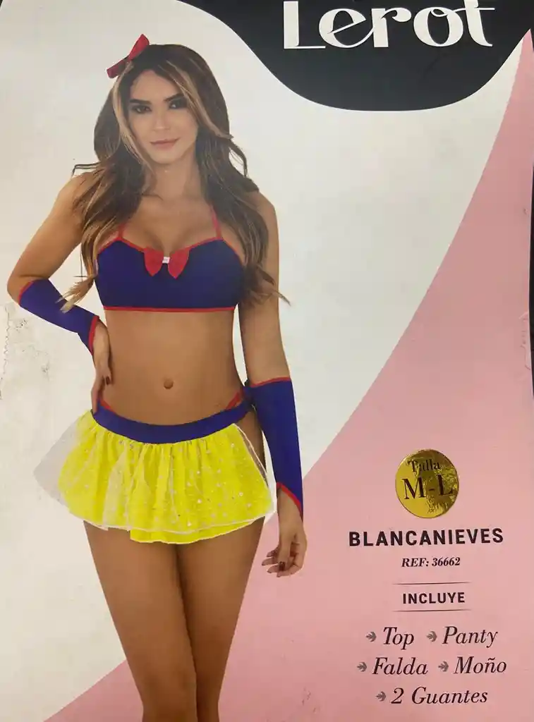 DISFRAZ DE BLANCANIEVES, TIRAS AJUSTABLES, PANTY TIPO BRASILERA, INCLUYE: TOP, PANTY, FALDA,MOÑO,DOS GUANTES