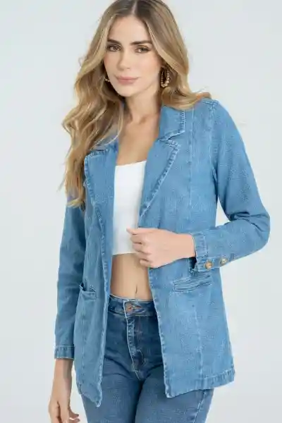 En Denim Rígido 100% Algodón Tono Medio Cuello Solapa Manga Larga Con Abertura y Botón en Puño Bolsillo de Ribete en Frente.