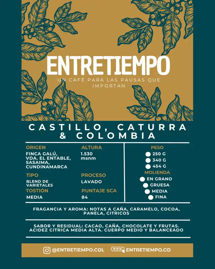 🍫 Blend Castillo · Caturra · Colombia – Cundinamarca Origen: Finca Galú, Vereda El Entable, Sasaima – Cundinamarca Altura: 1.530 msnm Variedad: Blend de Castillo, Caturra y Colombia Proceso: Lavado Tostión: Media Puntaje SCA: 84 Este café nace en la Finca Galú, en las montañas de Sasaima, donde distintas variedades conviven en una misma finca y se combinan para crear una taza balanceada, dulce y muy fácil de disfrutar. La tostión media resalta su perfil clásico y honesto, pensado para acompañar el día a día. Fragancia y aroma: notas a caña de azúcar, caramelo, cocoa y panela, acompañadas por un toque cítrico fresco. Sabor y residual: en boca predominan cacao, caña y chocolate, con matices frutales que aportan vivacidad y un residual limpio y agradable. Acidez: cítrica media-alta, brillante pero equilibrada. Cuerpo: medio y balanceado. ☕ Un café versátil y amable, ideal para quienes buscan una taza confiable y dulce. Funciona muy bien en prensa francesa, filtro tradicional o moka, perfecto para disfrutar a cualquier hora.