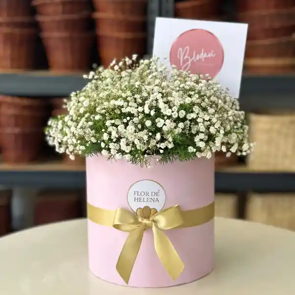 Expresa tus sentimientos con un hermoso diseño floral elaborado por Blodau con gypsophilias y pino, en una caja especial para flores