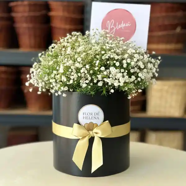 Expresa tus sentimientos con un hermoso diseño floral elaborado por Blodau con gypsophilias y pino, en una caja especial para flores