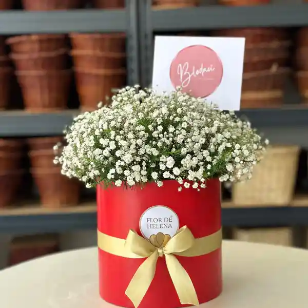 Expresa tus sentimientos con un hermoso diseño floral elaborado por Blodau con gypsophilias y pino, en una caja especial para flores