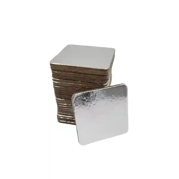 Blonda de cartón 5x5 cm metalizados reflectantes de color plateada una cara. Para base de tortas, postres, ponqués, tartas, etc.