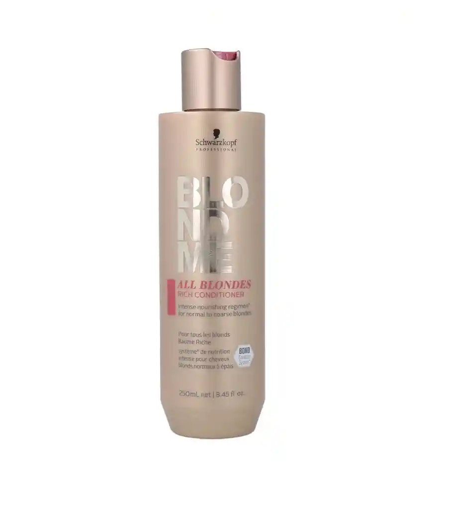 Blondme All Blondes Rich Acondicionador 250mL El acondicionador BLONDME All Blondes Rich, con tecnología de creación de enlaces 3D y complejo de proteína de cachemira, ayuda a construir nuevos enlaces, mientras desenreda, alisa y suaviza instantáneamente los tipos de cabello rubio normal a grueso. Beneficios: Desenreda instantáneamente el cabello. Proporciona brillo. Nutre profundamente el cabello. Mejora la fuerza y elasticidad del cabello. Modo de uso: Aplique sobre el cabello limpio y húmedo. Déjelo durante tres minutos.