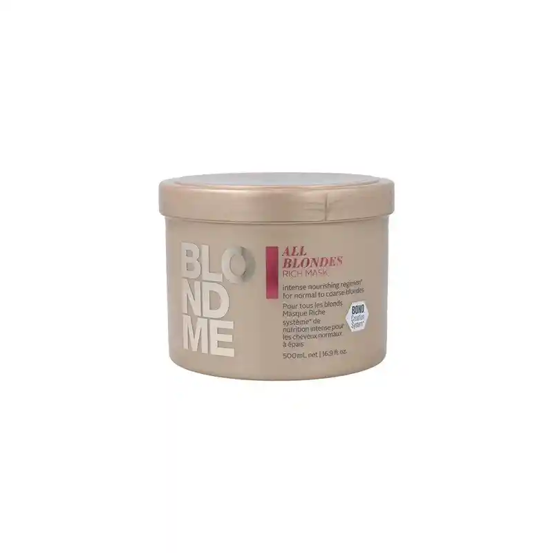 Blondme All Blondes Rich Mascarilla 500mL Schwarzkopf BLONDME All Blondes Rich Mask es una mascarilla capilar profundamente nutritiva desarrollada específicamente para tipos de cabello medio a grueso. Además, es adecuado tanto para cabellos rubios naturales como aclarados. Esta mascarilla trabajará tanto en la estructura interna como externa del cabello para asegurar un cuidado y acondicionamiento completo. Esto es particularmente importante para el cabello rubio aclarado que tiende a ser más frágil y dañado. Beneficios: Reconstruye y restaura la unión del cabello fortaleciéndolo. equilibrará el nivel de pH del cabello. Contiene aceite de Marula dejando el cabello con un aspecto saludable y brillante. Modo de Uso: Aplica la mascarilla uniformemente sobre el cabello mojado. Deje trabajar el producto hasta por un minuto. Luego enjuague bien.