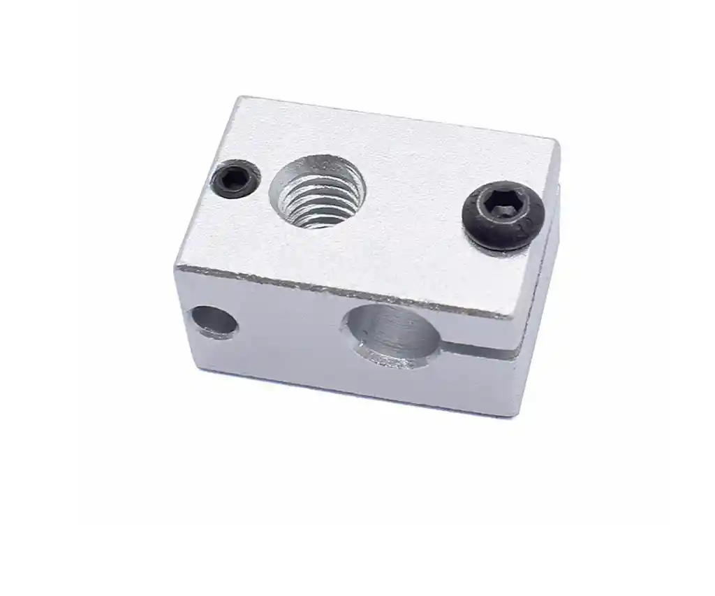 Nombre: Bloque calentador oficial V6 Tamaño: largo x ancho x alto 23*16*12mm. Ajuste a: Extrusora Hotend V6 J-head Compatible con: calcetín oficial de silicona V6 Material: Aluminio. Aceptar boquilla con rosca M6. Orificio interior para el tubo del calentador: 6 mm. Orificio interior para termopar/termistor: 4 mm. Orificio interior para tornillo de fijación: M3. LA COMPRA INCLUYE: 1 X BLOQUE ALUMINIO V6 NUEVA VERSION PT100